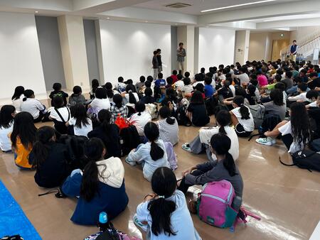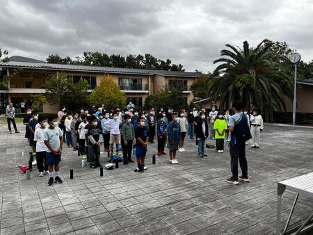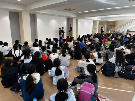 無事伊豆高原学園に到着しました。みんなよく歩きました!開園式で学園長さんのお話を聞き、学園のルールや生き物について教えていただきました。代表児童のあいさつも上手でした。これから、部屋に入ります。