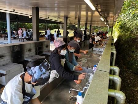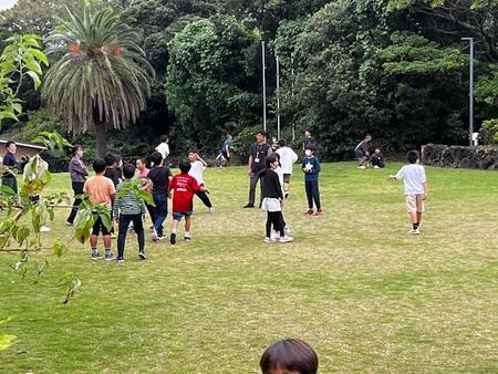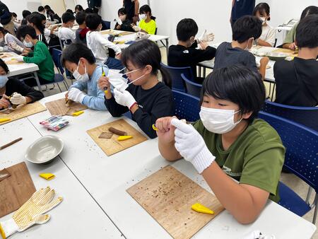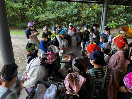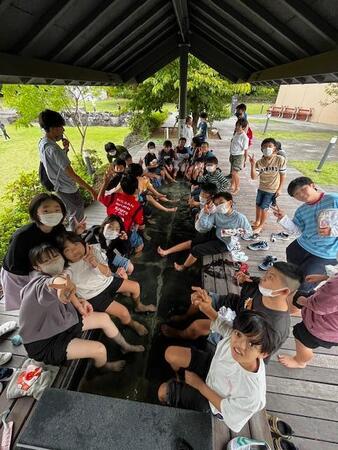 スプーン作りを終え、おやつタイムです。美味しいスイートポテトを食べた後は、スポーツ広場で遊んだり、足湯に入っりしています。