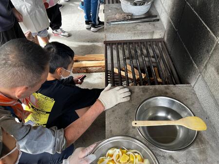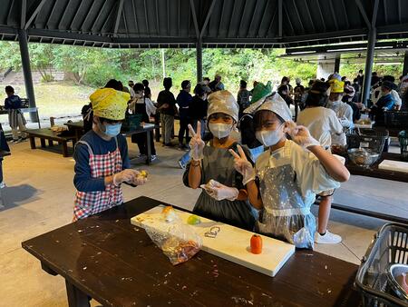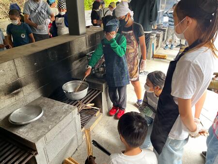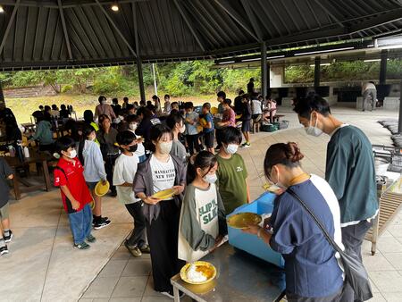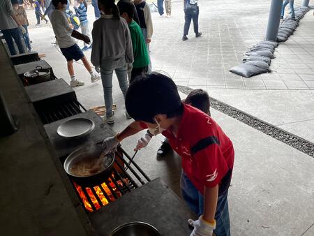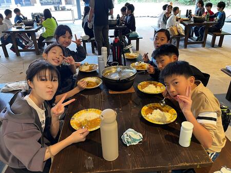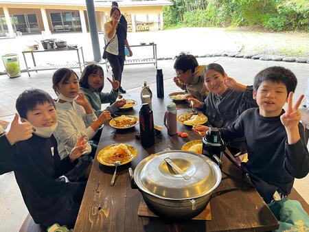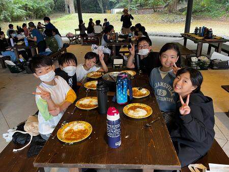 薪に火をくべ、炎と煙と格闘しながら調理が進んでいます。班で協力して順次美味しそうなカレーが出来上がってきました。全員無事カレーを作って美味しくいただきました。