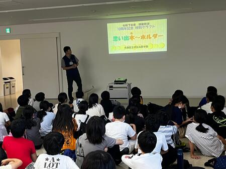 剪定木のお話やキーホルダーの作り方の説明を聞いています
