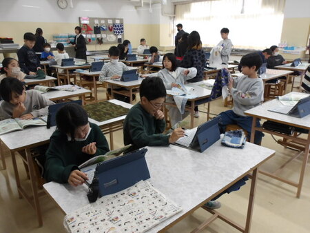 3校時の家庭科室です。5年生が、授業をしています。「ランチョンマット」の制作の学習です。どのように作っていくのか制作計画を考えています。先生が用意したいくつかの工程のお手本を見ながら、どの順番に制作していくのか考えています。一人で考えたり、近くの子と話し合ったりしながら、その制作過程について学んでいます。前回までミシンの練習をしてきたので、ミシンを使って上手に世界に一つだけのランチョンマットができるといいです。