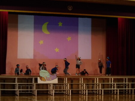 3校時の体育館です。2年生が学芸会の練習をしています。こどもたちもセリフを覚えていますが、動きはまだまだのようです。これからどんどん上手になってすてきな劇になっていくことでしょう。2年生がんばって!