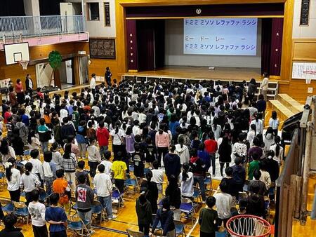 今朝の体育館です。今月の音楽朝会をしています。今日の歌は、「ドレミの歌」です。1,2,3年生の歌うパートと4,5,6年生が歌うパートと分かれて歌っています。今月もきれいな歌声が体育館に響きました。