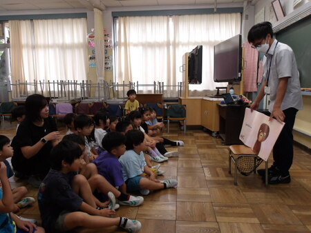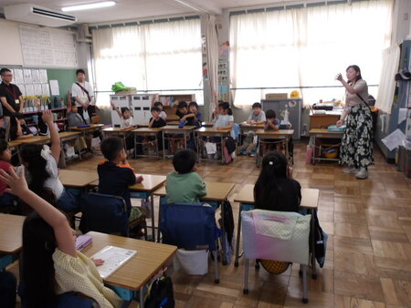 3校時、1年生が、外国語活動の学習をしています。国際都市大田区では、低学年の外国語活動の時間が、昨年度までの8時間から今年25時間に増え、英語の学力を向上させる取組をしています。この時間は、ALTの先生が、大きな絵本を読んでいます。「テディーベア」の本です。ゴミ箱に捨てられたばらばらになったテディーベアのぬいぐるみが、耳(Eear)や腕(Arm)、足(Leg)、しっぽ(Tail)などをつけて元のぬいぐるみになる絵本です。絵本を読みながら、体の部位の英語を覚えています。