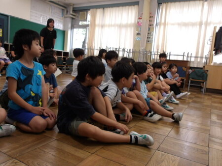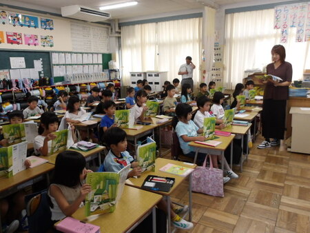 2校時の1年生の教室です。国語の学習をしています。今日から「くじらぐも」という新しい単元に入ります。題名から予想できるお話の内容を話し合うことで、お話に対する関心を高めています。先生が読み始めるとみんな真剣に聞いています。先生が、「会話の部分をどう読んだらいいのか考えながら、みんなで読みましょう。」と声をかけ、みんなで読んでいます。会話の部分になると元気な声で、読んでいます。お話を読んだ後に、「このお話を読んでない人に内容を教えるつもりでノートに書いてみましょう。」と声をかけ、一人ひとり誰が何をしたのか考えながらノートに書き、発表しています。