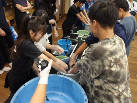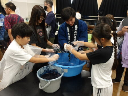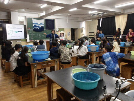 2校時の理科室です。6年生が、新教科「おおたの未来づくり」の学習をしています。6年生は、藍染めの学習をしています。講師の方にお越しいただき、藍染めの歴史や特徴についてお話をいただいた後、実際に藍染めをしています。上手に藍染めができて、すてきな作品ができています。これから、藍染めを広める学習をしていくところです。