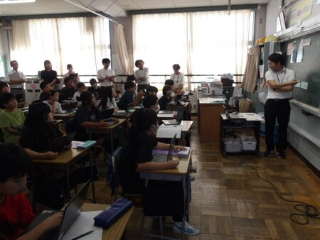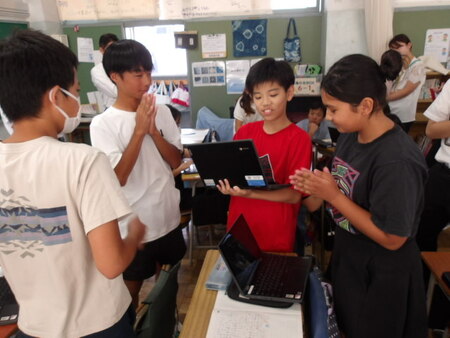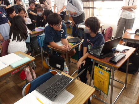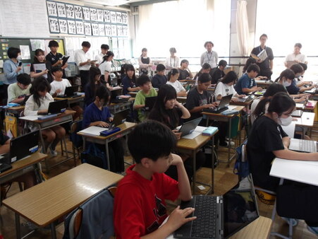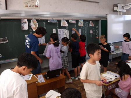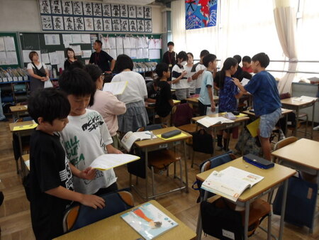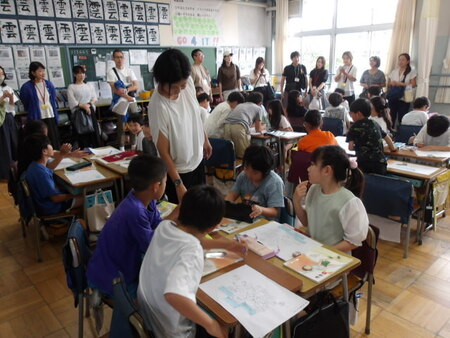 今日の5校時は、校内研究授業をしています。今日は、6年生が話題提案授業です。おおたの未来づくりの学習です。6年生は、先週の藍染め体験から自分たちにやりたいことを考えています。一人一人が考えたことを、グループで共有して全体発表しています。体験したことで、こどもたちの思いが強まっていたようです。これからその実現に向け学習をさらにすすめていきます。