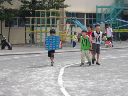 5年生児童が、お手本を見せてくれています。他の学年の人とじゃんけんをして、楽しく体を動かしています。短い時間でしたが、2周回ることのできた子もいました。