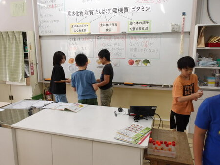 5校時の家庭科室です。5年生が家庭科の学習をしています。前回の調理実習を受け、五大栄養素について学習しています。こどもたちが歌って覚えている「まほうの朝ごはん」の歌詞を振り返りながら、栄養素について考えています。授業の終わりには、タブレットで栄養素クイズをし、楽しみながら学習をしています。どの子も真剣に考えて学習をすすめています。