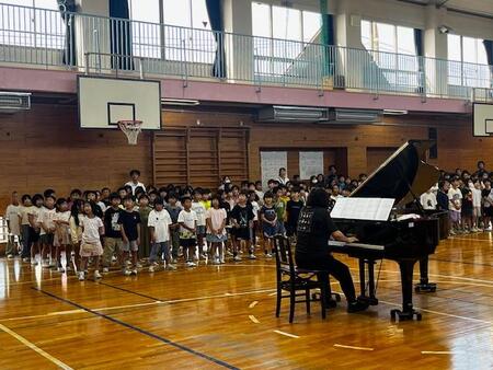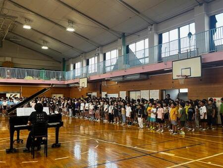 今朝の体育館です。音楽朝会をしています。今月の歌は、「歌えバンバン」です。今朝もすてきな声が体育館に響きました。授業で上手だった4年生が代表して、歌ってくれました。最後にみんなで合唱をしました。来月は、5年生が連合音楽会で披露する合唱を聴くことになっています。