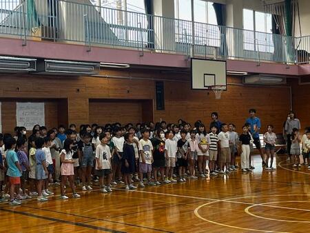 体育館での全校朝会です。今年度から月に1回、体育館に集まり全校朝会をしています。今週は、早寝早起き朝ごはん週間です。今朝は、校長先生のお話のあと、保険給食委員会のこどもたちが、全校児童に意識してほしいとクイズを出しています。こどもたちは、〇×でクイズに答えています。早寝早起きして朝ごはんを食べて登校できるようになってほしいところです。