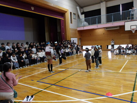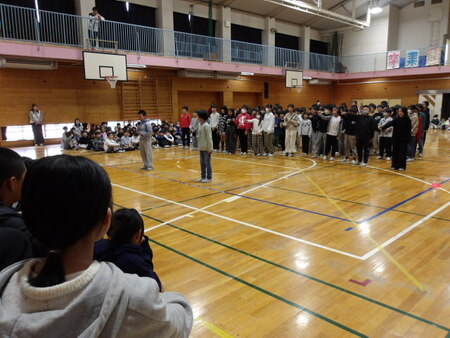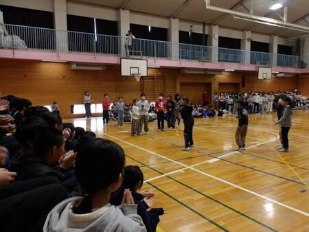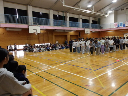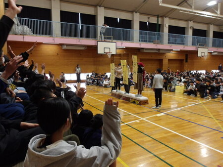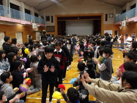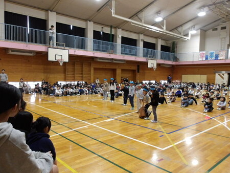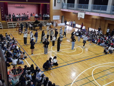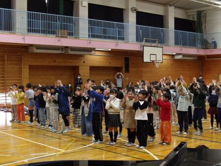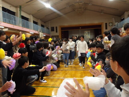 今日は、6年生を送る会が開かれています。今まで道塚小を引っ張ってきてくれた6年生に感謝の気持ちを込めて、各学年が出し物をしています。6年生もお礼の出し物をしています。どの学年もよく考えて、練習してきた出し物で温かな会となりました。