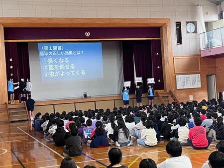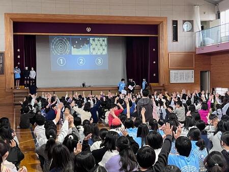 今日は、6年生が全校児童に向けて、「おおたの未来づくり」で学習してきた「藍染」について発表をしています。先日カムカム新蒲田で発表したグループとは、別のグループが発表しています。クイズを入れながら楽しませながら発表しています。「藍染の学習」が本校の伝統になりつつあります。