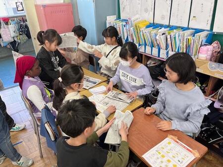 4年生の教室です。4年生が総合的な学習で学んできた「防災」について、3年生や2年生に向けて発表をしています。大地震の様子や新聞で作る防災スリッパの作成などの体験型発表があったり、タブレットを使った発表あったりするなど学んできたことをわかりやすく発表していて感心します。