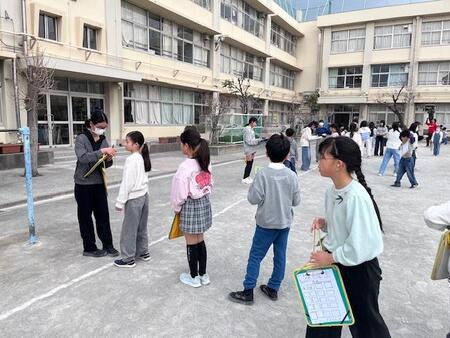 今朝の校庭です。今年度最後の集会が行われています。今日は、お世話になった6年生にサインをもらおうという集会です。校庭の周りに並んだ6年生から一人ひとりサインをもらって集めています。残り数日となった6年生との別れを惜しみながら、サインをもらっている下級生です。