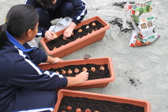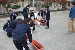 中学生たちは、苦労しながら小学生に道具の持ち方などを教えようと努力していました。