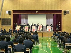 卒業を控えた三年生へ感謝の気持ちを伝えるため、「三年生を送る会」を実施しました。前半は、在校生が書いたメッセージカードを、満開の桜に見立てた掲示物として贈呈しました。後半は、各学級や部活動、代表生徒からのメッセージ動画を上映し、三年生への感謝と応援の気持ちを届けました。会場は温かい雰囲気に包まれ、心に残る会となりました。