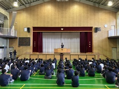 昨年度、生徒からの提案で開始した生徒会朝礼。生徒会活動を活性化し、生徒たちの主体性が生かされ、充実した会になることを期待しています。