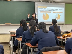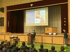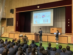 始業式のあと、11月に実施した大田区海外派遣の報告会を行いました。
