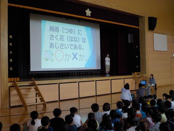 集会委員会による梅雨に関する〇×クイズ。簡単な問題や難しい問題とバリエーション豊かで1年生か6年生が楽しめるクイズでした。委員会の高学年児童が主体的に工夫して取り組んでいます。