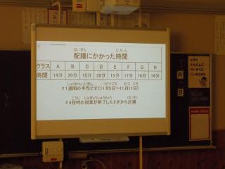 インフルエンザ感染予防のため、給食集会を放送で行いました。給食委員会の児童が、給食の時間の過ごし方やマナーについて、調査を行ったり、まとめたりして発表しました。配膳にかかる時間を短縮しようと努力したり、感謝の気持ちを込めて片付けをしたりする態度が育っていくことにつながったと思います。