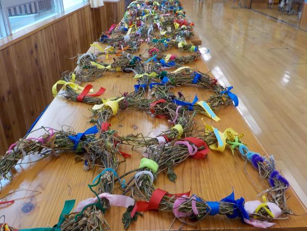 1年生が植木鉢で大切に育ててきたあさがおは、夏にきれいな花を咲かせみんなを楽しませてくれましたが、そろそろその命も終わりに近づきました。一生懸命に育てたあさがおの茎や葉やつるを使って、最後はリースを作りました。植木鉢からあさがおを抜き、くるくるとねじり輪にします。各自で持ち寄ったリボンなどの飾りをつけてできあがりです。あさがおを最後まで大切にして作ったリースは、どれも素敵でした。「ぼくはクリスマスの色にしたくて、赤のリボンをつけたよ!」などと、工夫したことを教えてくれました。