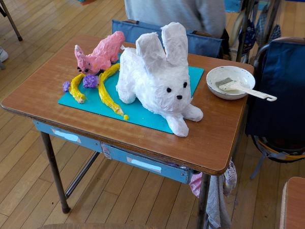 3年生は、社会科で昔の道具などについて学習しており、月曜日には七輪体験をした学級もあります。図工では、日本の伝統玩具である張り子を使った工作をしています。新聞紙を丸めて好きな動物の形を作り、ガムテープで固定します。その上に花紙を貼っていきます。好きな色の花紙を選ぶことで、動物の色付けがされていきます。目や口も花紙を切って貼っていきます。とても素敵な作品の数々が出来上がっていました。