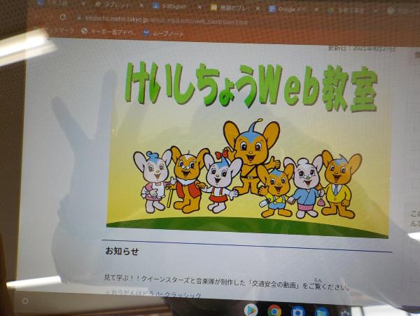 今日の避難訓練は、不審者が侵入した場合の対応についての訓練でした。不審者の侵入を知らせる放送が流れたら、身を守る行動をします。担任や担当教員の話をしっかりと聞き、教室でバリケードを作りました。自然災害のときのみならず、放送や担任の話をしっかりと聞き、落ち着いて行動することが大切です。今日は、田園調布警察署からも担当の方にお越しいただき、児童の安全な生活についてお話をしていただきました。併せて、安全についてのインターネットサイトもお知らせいただきました。タブレット端末のトップ画面にアイコンが入っています。時間があるときに入って、読んでくれるといいなと思います。