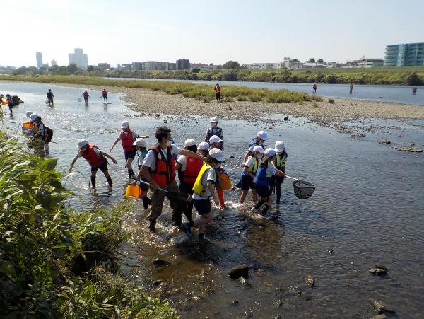 今日もお天気に恵まれ、4年生が無事に多摩川活動を行うことができました。草や岩の陰を「ガサガサ」して、上手に生きものを捕まえました。4年生は、3年生で学習したことを受けて、さらに内容を広げています。どんな生きものが、川の中のどのようなところに住んでいるか、捕れた生きものの特徴や、さらにはどんなものを食べて生きているのかなど、様々な面に興味をもって学習しています。今日も、大きなカニや、うなぎなどが捕れて、子供たちも大喜びでした。子供たちのお手伝いや、安全を見守ってくださった保護者の方々に、お礼を申し上げます。ありがとうございました。