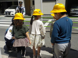 先週の金曜日に1年生は歩行訓練を受けました。当日は教育委員会の方と田園調布警察署のお巡りさんが来てくださいました。