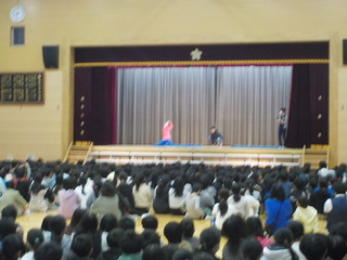 集会委員会の児童の名演技に子供たちも笑ったり考えたりして、楽しい時間を全校児童で過ごすことができました。