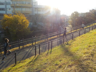 先月から始まった朝練も大詰めを迎え、本日から校庭だけでなく土手を活用した練習が始まりました。