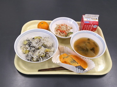 11月27日(木)の給食は、さつま芋ごはん、鮭の紅葉焼き、ごまドレッシングサラダ、味噌汁、みかんでした。