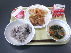 今年度最後の給食メニューは、赤飯、牛乳、鶏のから揚げ、昆布サラダ、すまし汁、イチゴのアイスでした。「進級、卒業のお祝い給食」、おいしくいただきました。