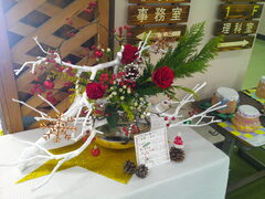 ロビーには生け花が、グランドの芝の上にはアンパンマンが
