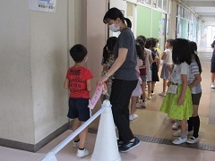 1年生 クラスの半分で学校探検です。初めての校舎内に興味津々です。