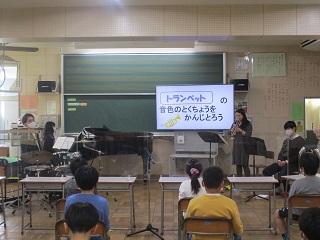 3年生の音楽の授業はプロの演奏家を招いての鑑賞の授業です。運動会でおなじみの曲を聴いて、子どもたちは思わず体がうずうず動き出します。