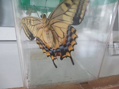 1学期最後の蝶の羽化は2羽同時でした。1羽はいつものナミアゲハ、もう1羽は珍しいキアゲハです。キアゲハの成蝶の姿かたちはナミアゲハによく似ていますが、幼虫の姿と食性は全く違います。ナミアゲハはミカンの葉を食べますが、キアゲハはセリ類(セロリ、パセリ、セリ)です。セリは強い農薬をかけて栽培されることが多く、スーパーで売っているセリ類では育てられません。たまたま、パセリを無農薬の家庭菜園で育てている方から、サナギになったキアゲハをもらい受けました。見比べてみて違いに気付く子供も多く、もらってきた甲斐がありました。自然や環境に強い関心を持ってもらえたらと思います。