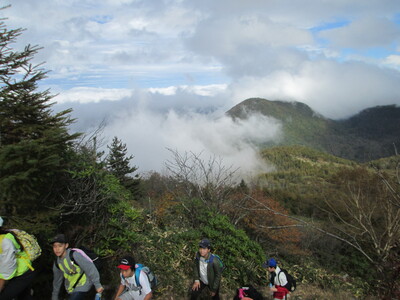 時折、登ってきた道を振り返ると、「うわ~、ずいぶん高いところまで登ってきたな~!!」と思うとともに、向かいの山々に少し雲がかかる幻想的な景色が見えました。