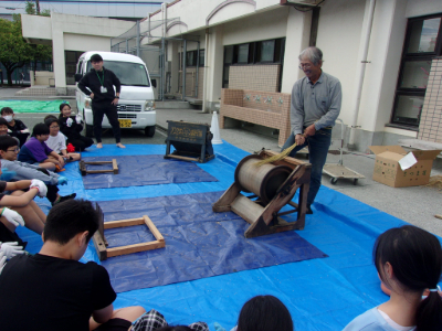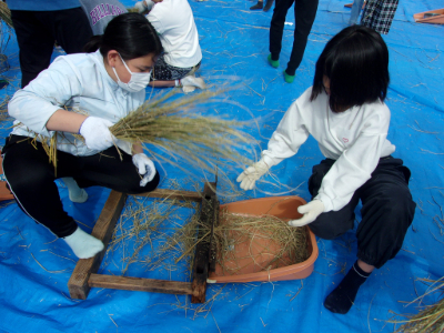 今日は、脱穀機や千歯扱きを使って、「もみ」を外す作業をしました。
