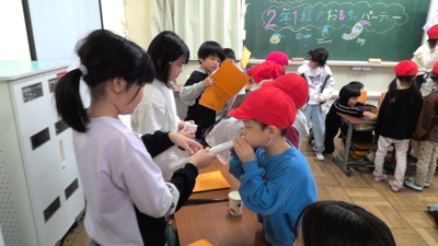 2年生のこどもたちは、自分が作ったおもちゃで楽しそうに遊ぶ1年生の姿を見て、とても嬉しそうにしていました。
