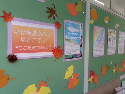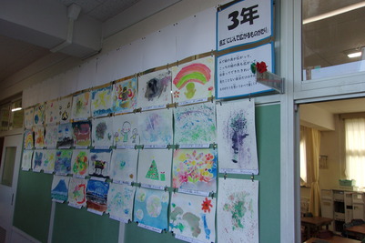 各教室前の掲示板には、図工や家庭科、総合的な学習の時間等に学習した成果物を展示します。
