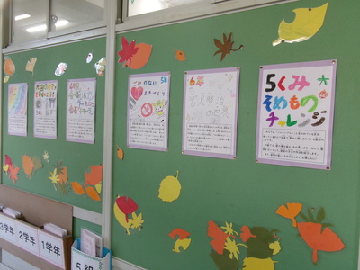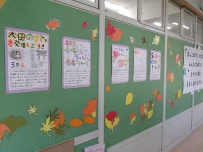 職員室前の廊下掲示板には、代表委員が主になって考えた今年のスローガンと、各学年の見どころ紹介ポスターが飾られています。