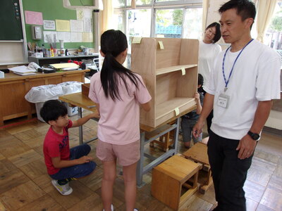 図工の海野先生に、ペンキやニス、はけ、筆の使い方を教わり、本棚に色を塗りました。