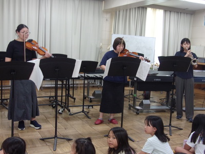 普段お目にかかれないドラムやトランペット、バイオリンにも触れることができ、楽しいクイズや楽器紹介のあと、先生方による演奏会が行われました。