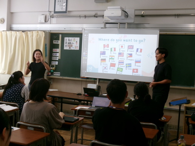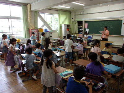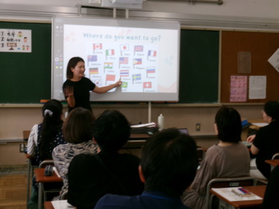 こどもたちに、楽しく外国語に親しんだり、興味関心を広げてもらったりできるよう、外国語担当教諭が講師役になり、他教員がこどもの立場に立って学びを深めています。