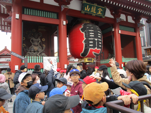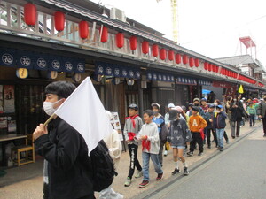 「浅草」では、担任が先頭で旗をもちながら、観光客で溢れる伝統のある町並みや浅草寺を見て回りました。
