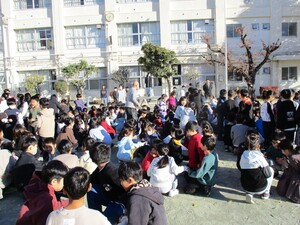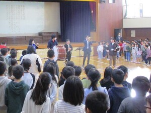 2回目は、教員が歌詞に合わせて、鈴を鳴らしたり、太鼓やカスタネット、タンブリンを叩いたりして、音楽朝会がにぎやかで華やかな感じの中で楽しく歌うことができました。