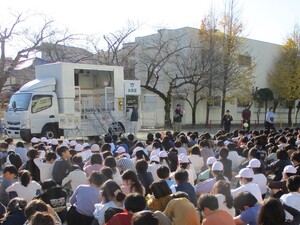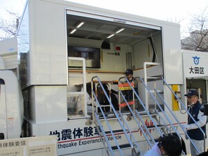 大田区防災課の職員の方からお話を伺った後、各学年の代表児童、4年と四組の全員が起震車体験を行いました。