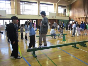 1年・6年は体育館で、平均台とマットを使って、ドンじゃんけんをしました。